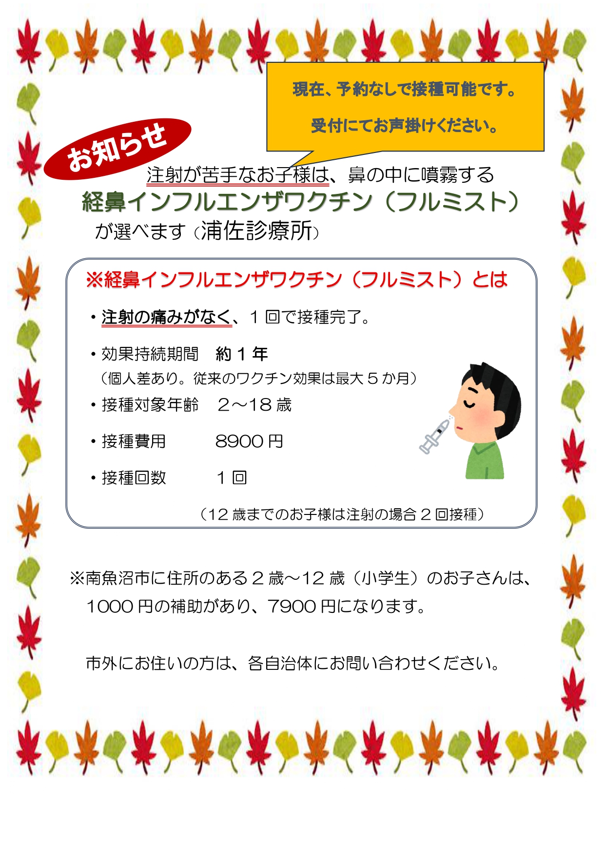 浦佐診療所よりお知らせ!フルミスト予約なしでも接種できます。