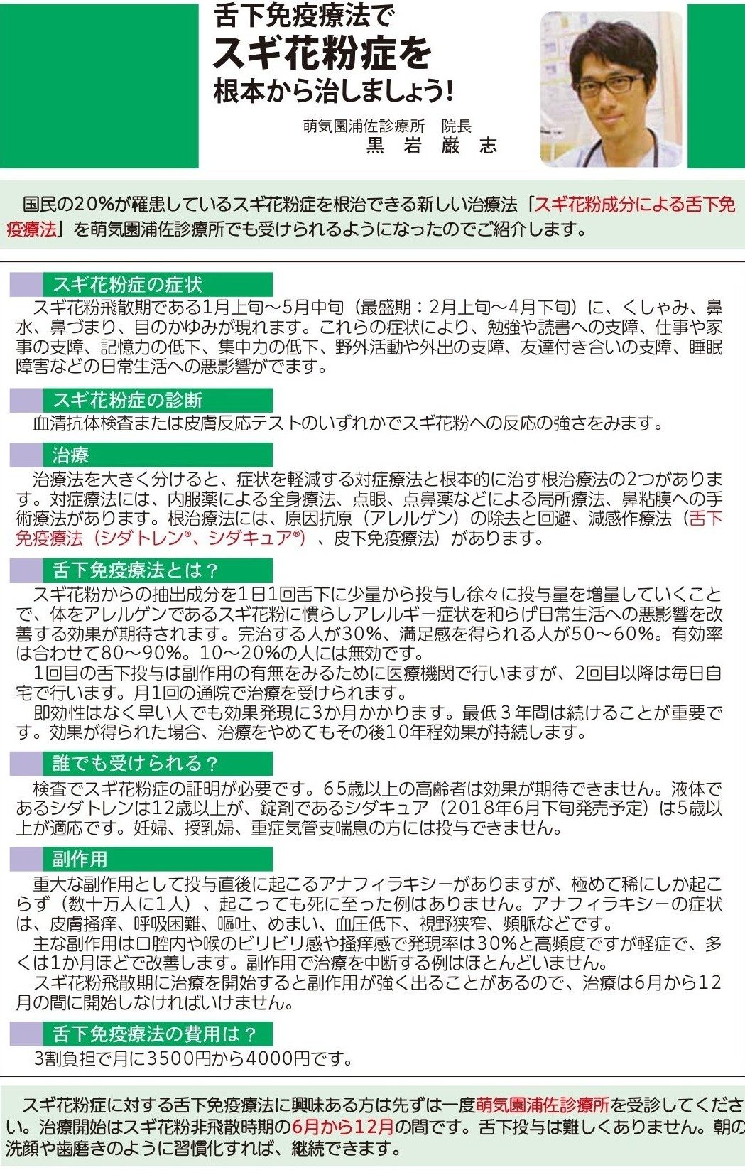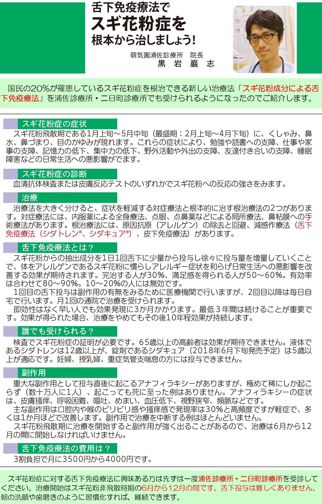 花粉症(舌下免疫療法) 2026年2月3日 浦佐診療所・二日町診療所より花粉症(舌下免疫療法)のお知らせ 花粉症の時期になってきました。 現在社会では2人に一人が発症していると言われるアレルギー性鼻炎 当院では、通常の内服治療、点鼻の相談に加えて、舌下免疫療法の治療などのご相談も承っております。 お気軽にご相談ください 舌下免疫療法につきましては、ご興味のある方は当法人の理事長の記事もご参照ください